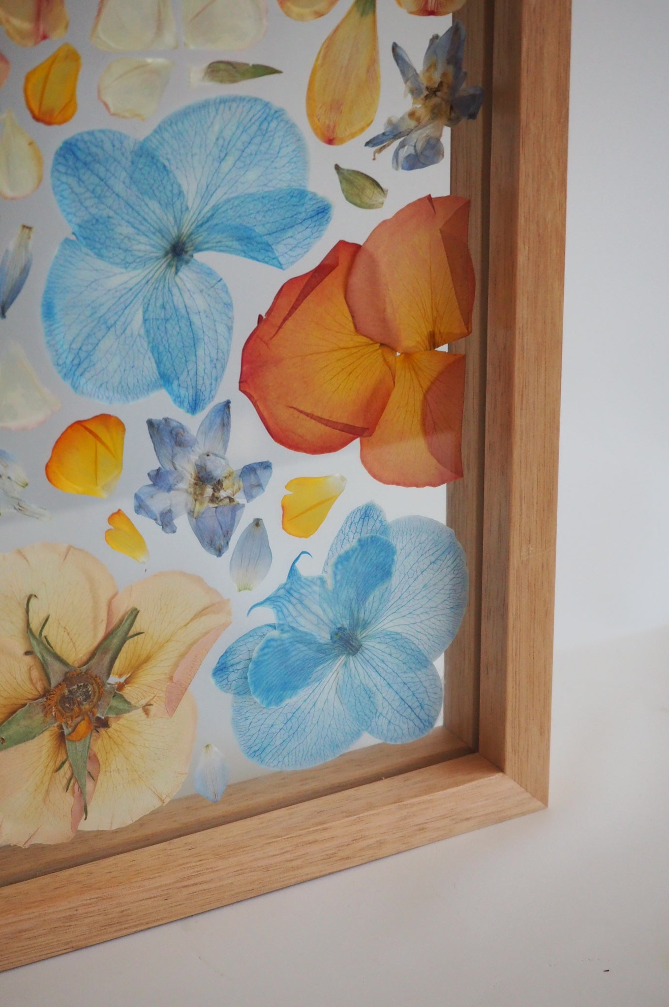 Melissa transformed my wife's bridal bouquet into a pressed flower artwork. We could not be happier with the end result; the purples and blues of the flowers were preserved beautifully, and the layout is stunning. We especially loved how she paid